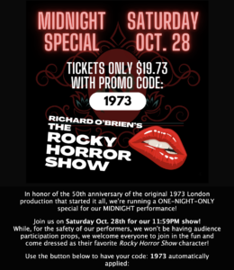 Opening night on Oct 27th is almost SOLD OUT and the midnight show on Oct 28th is filling up fast! If you can’t make opening weekend, you can still catch it on Thursdays, Fridays, and Saturdays through November 18th!