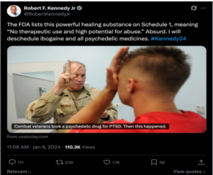 During his 2024 campaign for President, current Health and Human Services Secretary Robert F. Kennedy Jr. posted a tweet in which he vowed to decriminalize and legalize ‘all psychedelic medicines’ if elected, specifically mentioning ibogaine for its positive effects. See that tweet below,