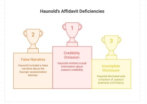 Special Agent Haunold did not disclose the 33 civil lawsuits. He forgot to mention fraud judgments totaling hundreds of thousands of dollars. He did not disclose the surrendered real estate license, the forged lease agreements, the City of Oakland fraud settlement. He did not disclose the pattern, documented over decades, in which Juarez accused business partners of crimes after defrauding them.